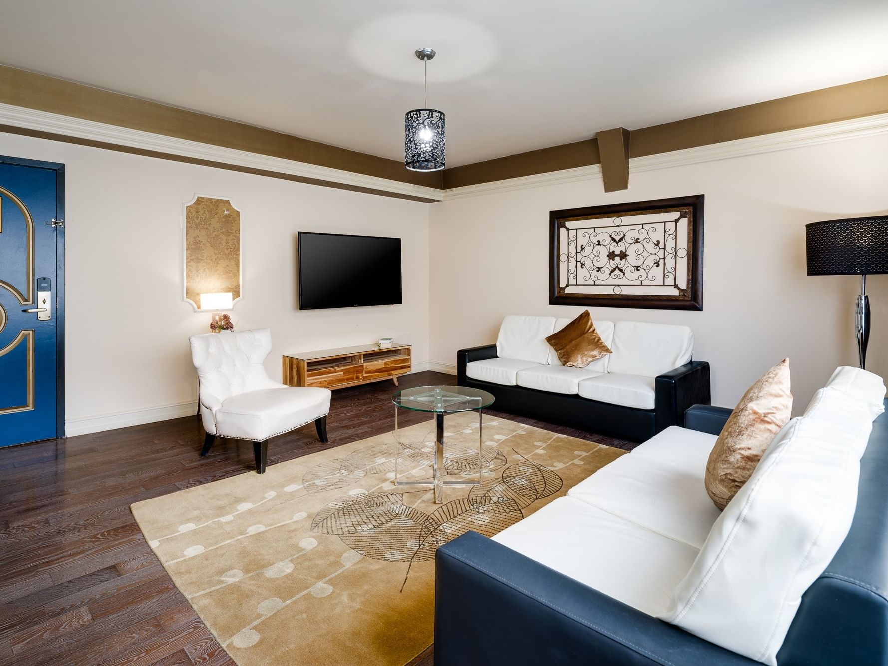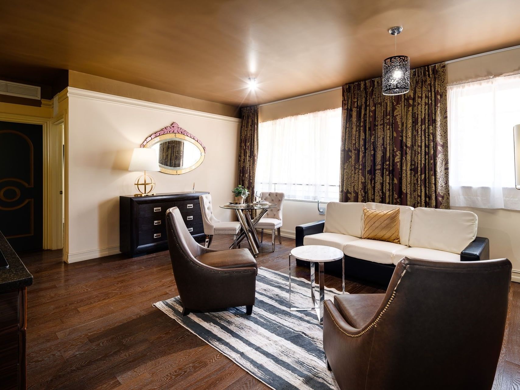 A spacious and stylish escape, this room features a plush king-size bed, sleek hardwood floors, and a cozy sitting area with a leather love seat.