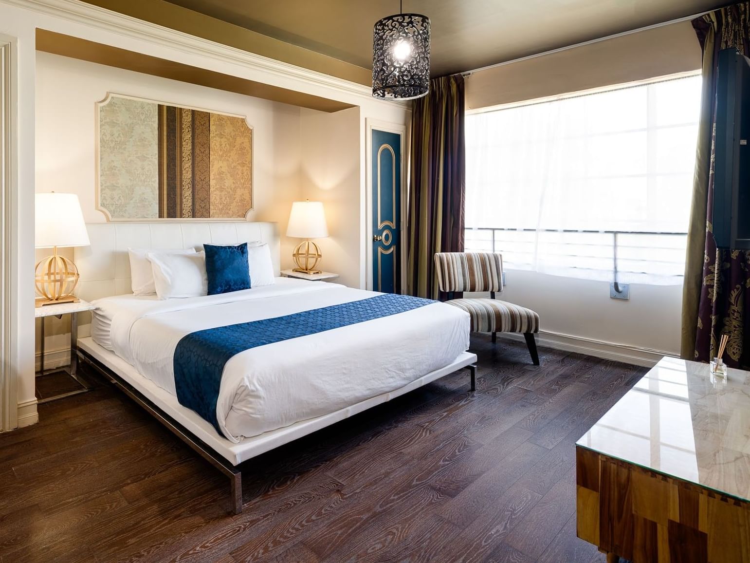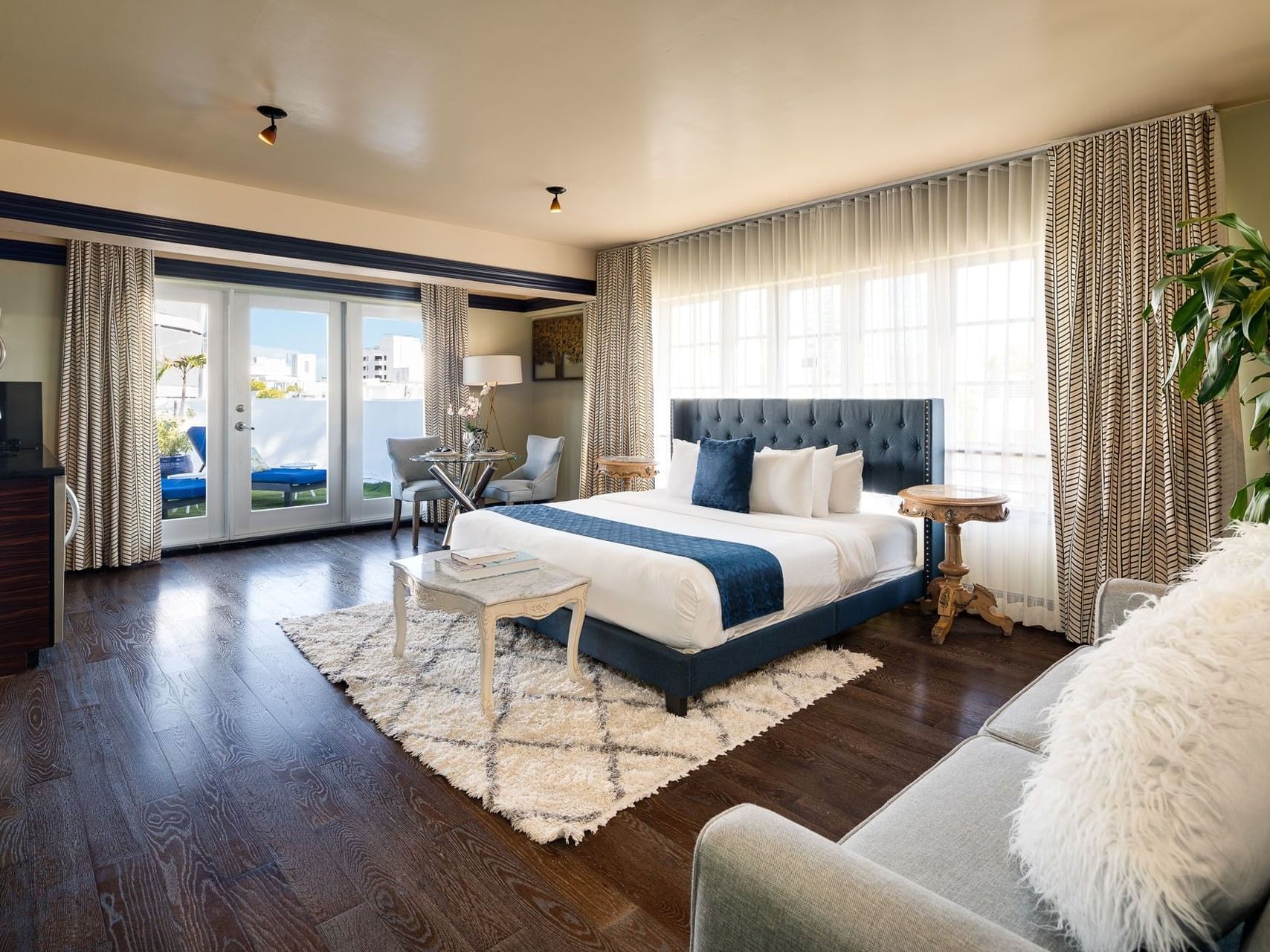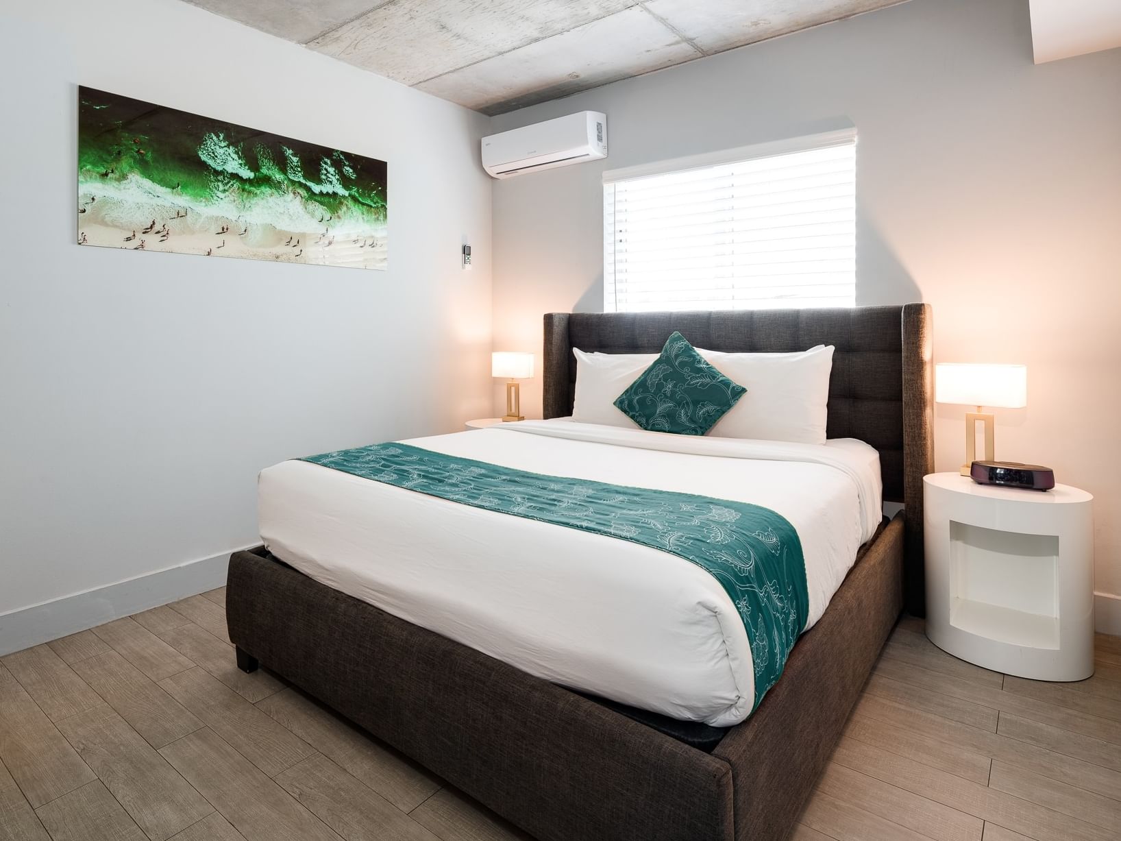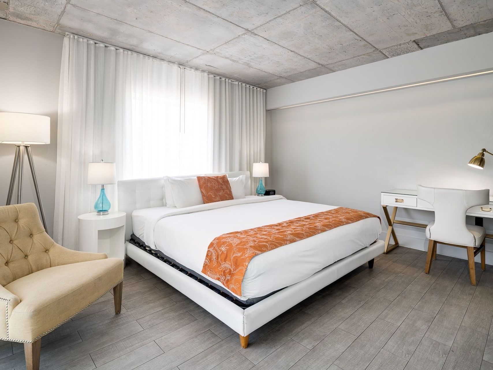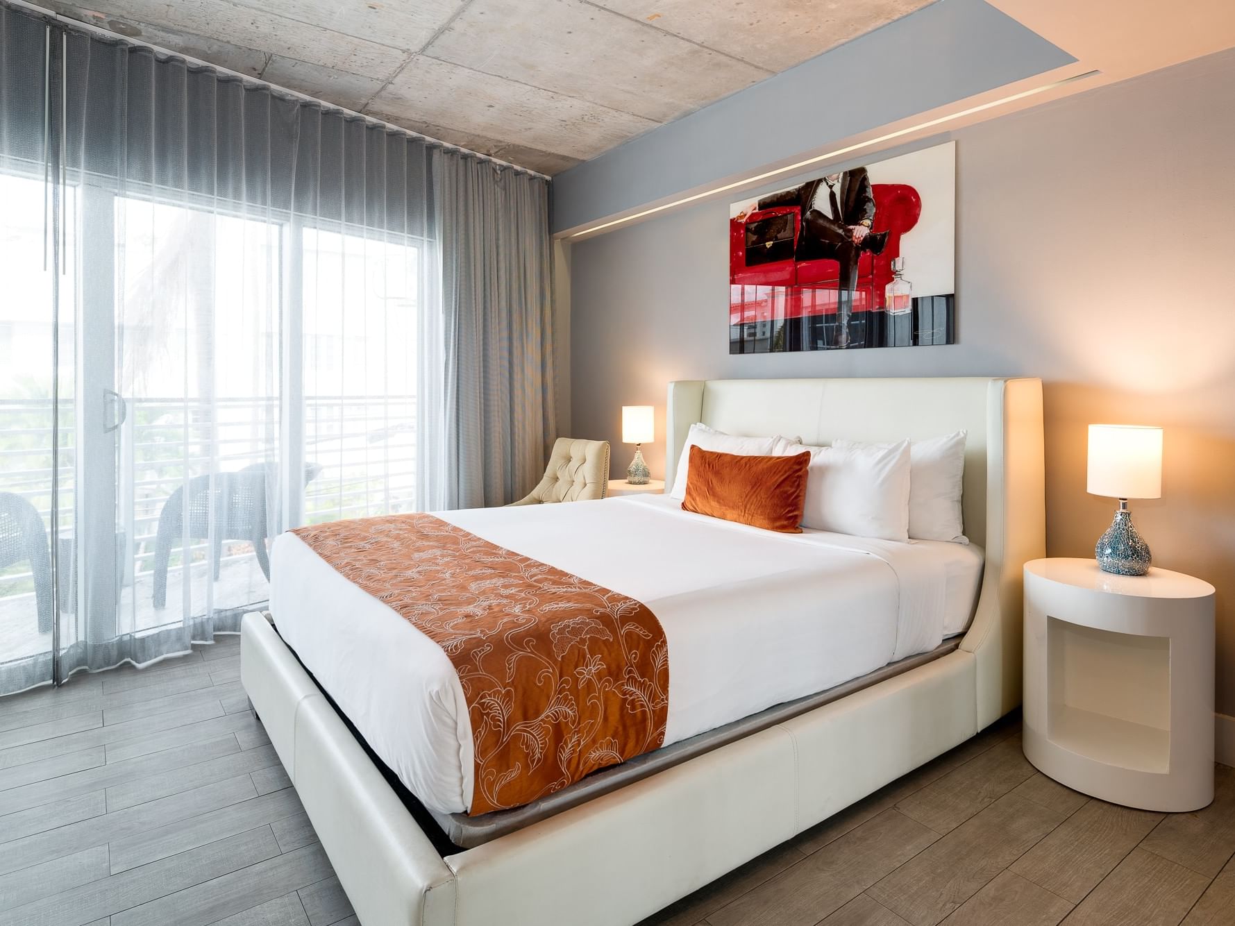 A chic and cozy retreat for your Miami adventure. This thoughtfully designed room features a luxurious queen-size bed and a comfortable sitting area, creating an intimate atmosphere for your escape.