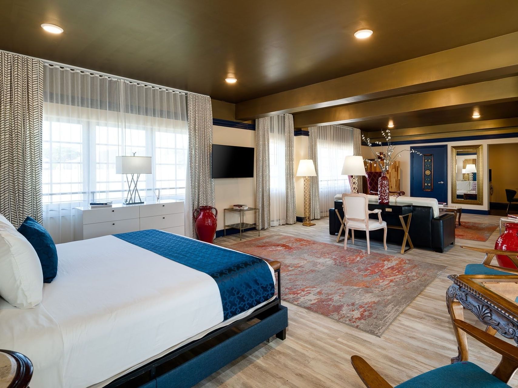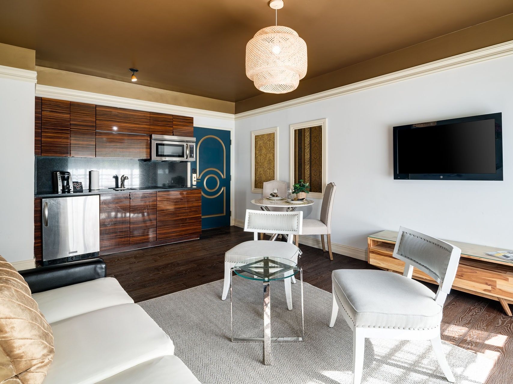 This suite is your personal oasis, blending a stylish work-from-home setup with the comfort of a king-sized bed and kitchenette.