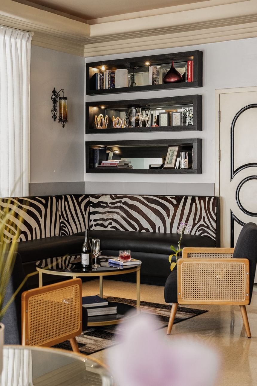 This luxurious suite provides a spacious experience with two plush queen-sized beds and a separate living room, elegantly furnished with a custom-designed leather sofa.